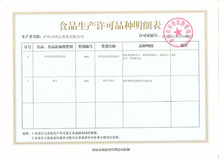 食品安全許可證明細(xì)表